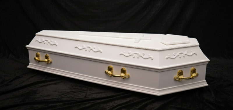 More info: White Matte Finished Coffin. (NAME AND CROSS FREE). Delivery charge extra.
